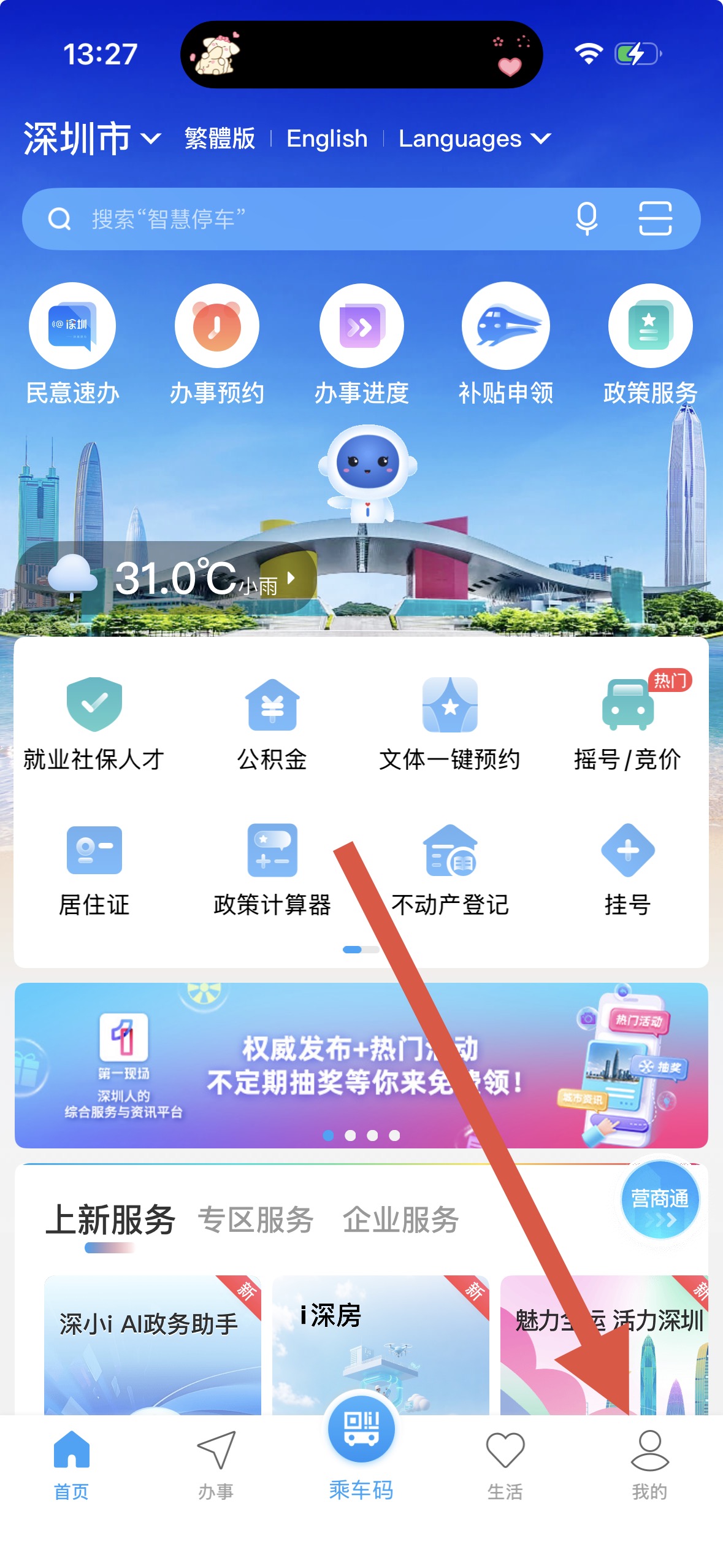 1、打開i深圳APP,在首頁點擊右下角我的選項進入個人頁面。