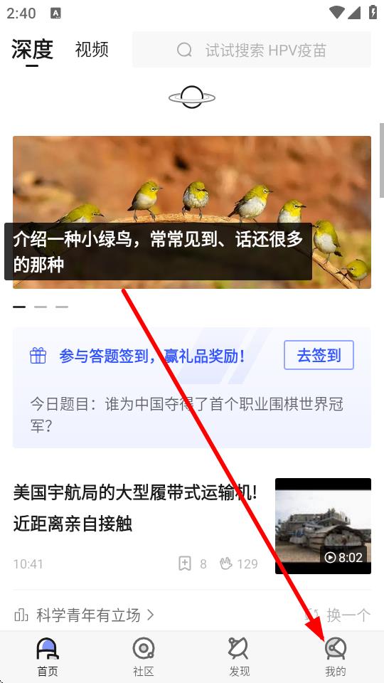 1、打開果殼網(wǎng)app進(jìn)入首頁,點擊底部導(dǎo)航欄中我的選項進(jìn)入個人頁面。