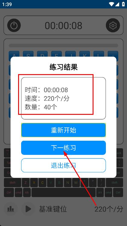 4、在彈出頁面中可以查看結(jié)果,點擊下一練習(xí)即可繼續(xù)練習(xí)。