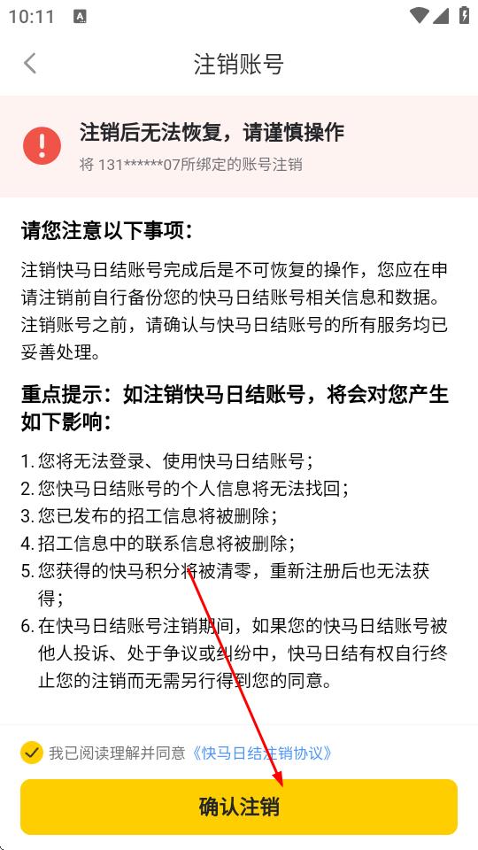 5、在注銷(xiāo)賬號(hào)頁(yè)面,勾選我已閱讀理解并同意快馬日結(jié)注銷(xiāo)協(xié)議,點(diǎn)擊確認(rèn)注銷(xiāo)。