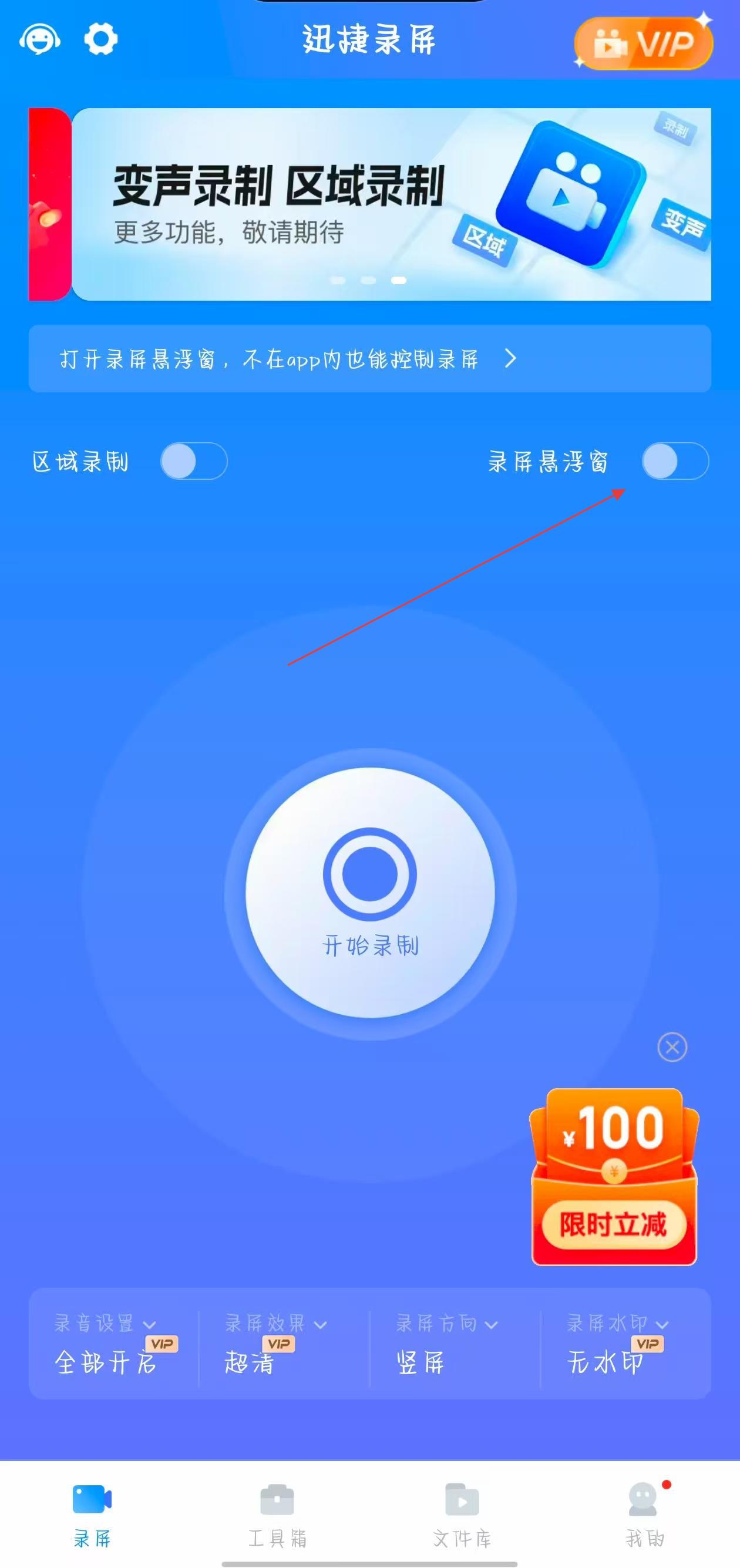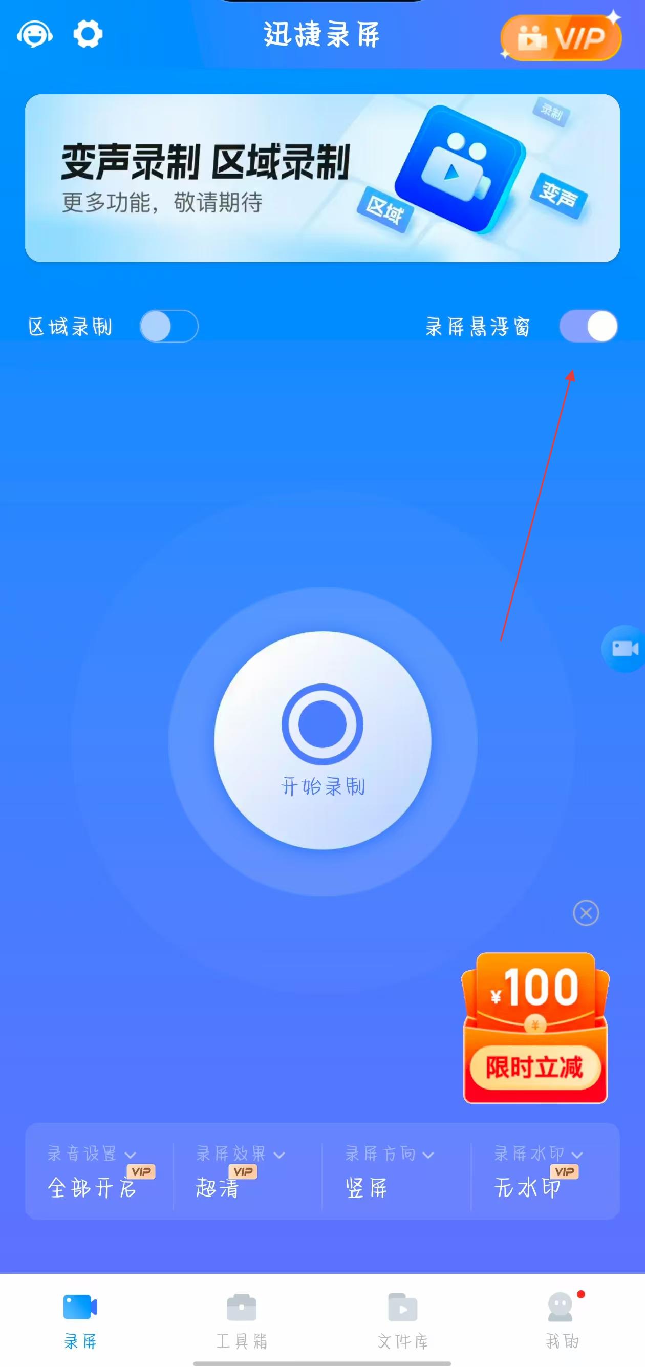 1、打開迅捷錄屏大師APP,在主界面找到錄屏懸浮窗開關(guān),點(diǎn)擊開啟該功能。