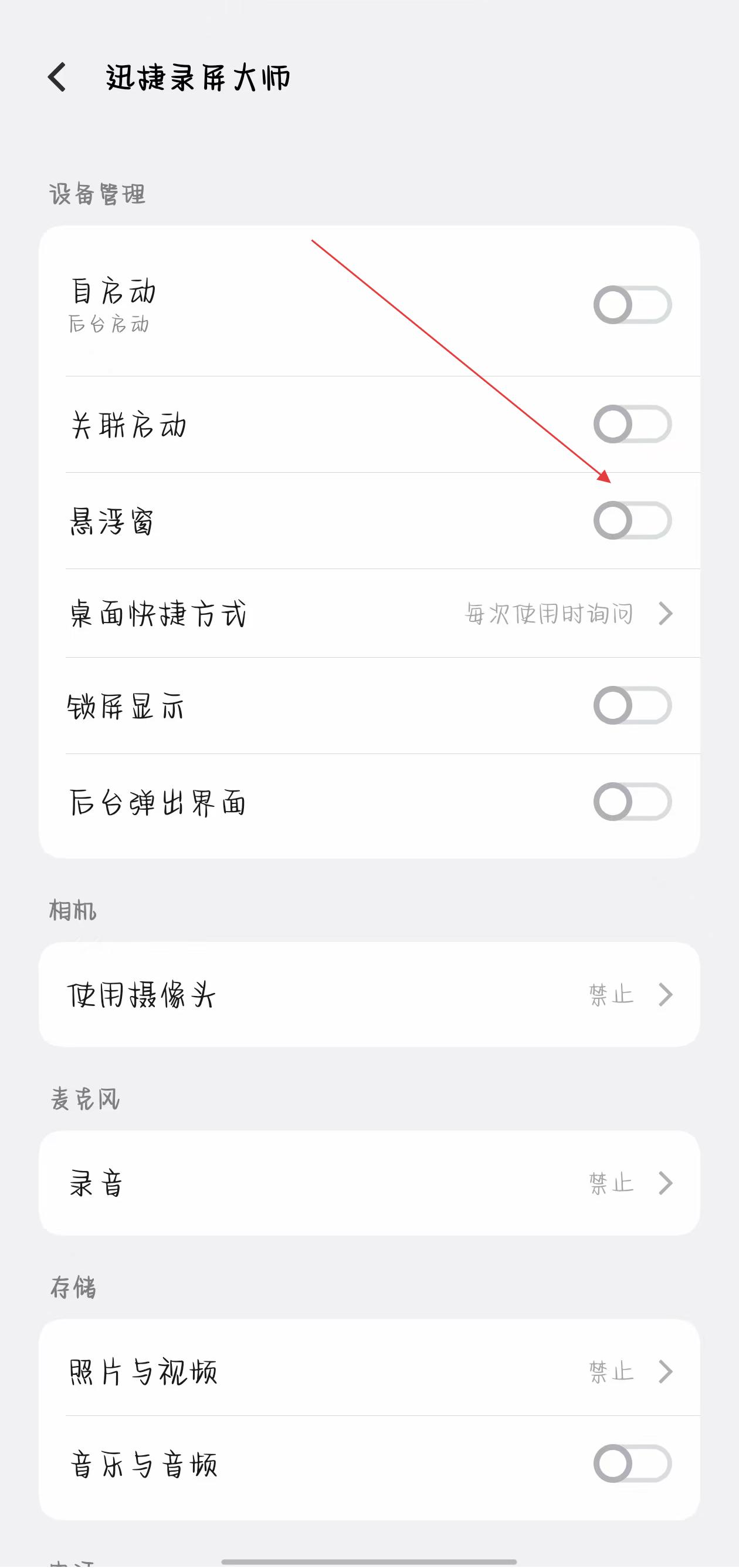 3、進(jìn)入手機(jī)系統(tǒng)的迅捷錄屏大師權(quán)限設(shè)置頁面,找到懸浮窗選項(xiàng),將其右側(cè)的開關(guān)打開。