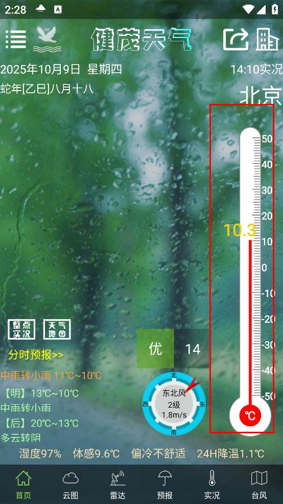 支持一周內(nèi)氣溫趨勢圖、實(shí)況溫度計(jì)動畫顯示以及風(fēng)向風(fēng)力盤圖等。