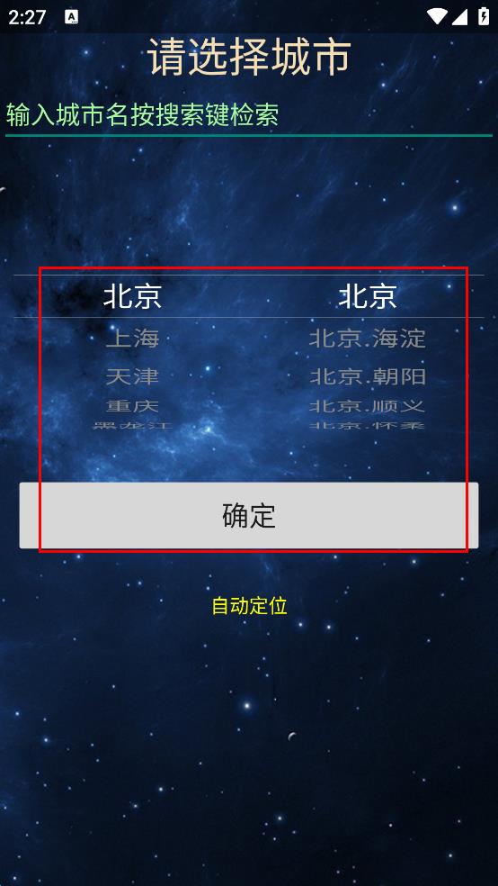 2、在城市選擇界面,選擇要查看天氣的城市,點(diǎn)擊確定按鈕,進(jìn)入城市管理頁面。