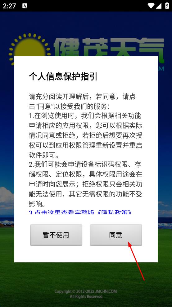 1、打開健茂天氣應(yīng)用,在個(gè)人信息保護(hù)指引彈窗中,點(diǎn)擊同意按鈕,進(jìn)入城市選擇界面。