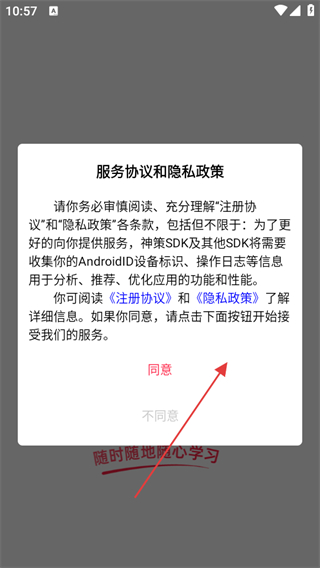 1、打開(kāi)美森網(wǎng)校APP,在彈出的服務(wù)協(xié)議和隱私政策界面,點(diǎn)擊同意。