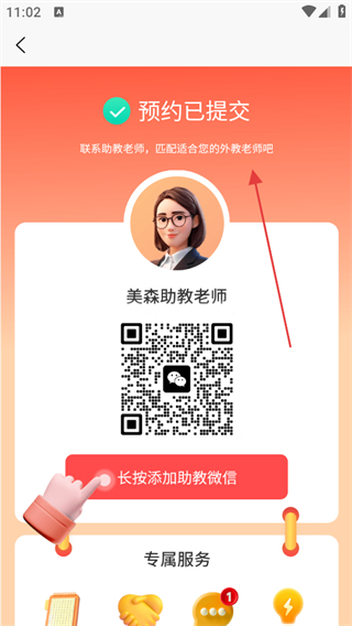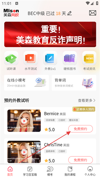 3、進(jìn)入該外教的教師檔案頁(yè)面后,再次點(diǎn)擊底部的免費(fèi)預(yù)約按鈕。