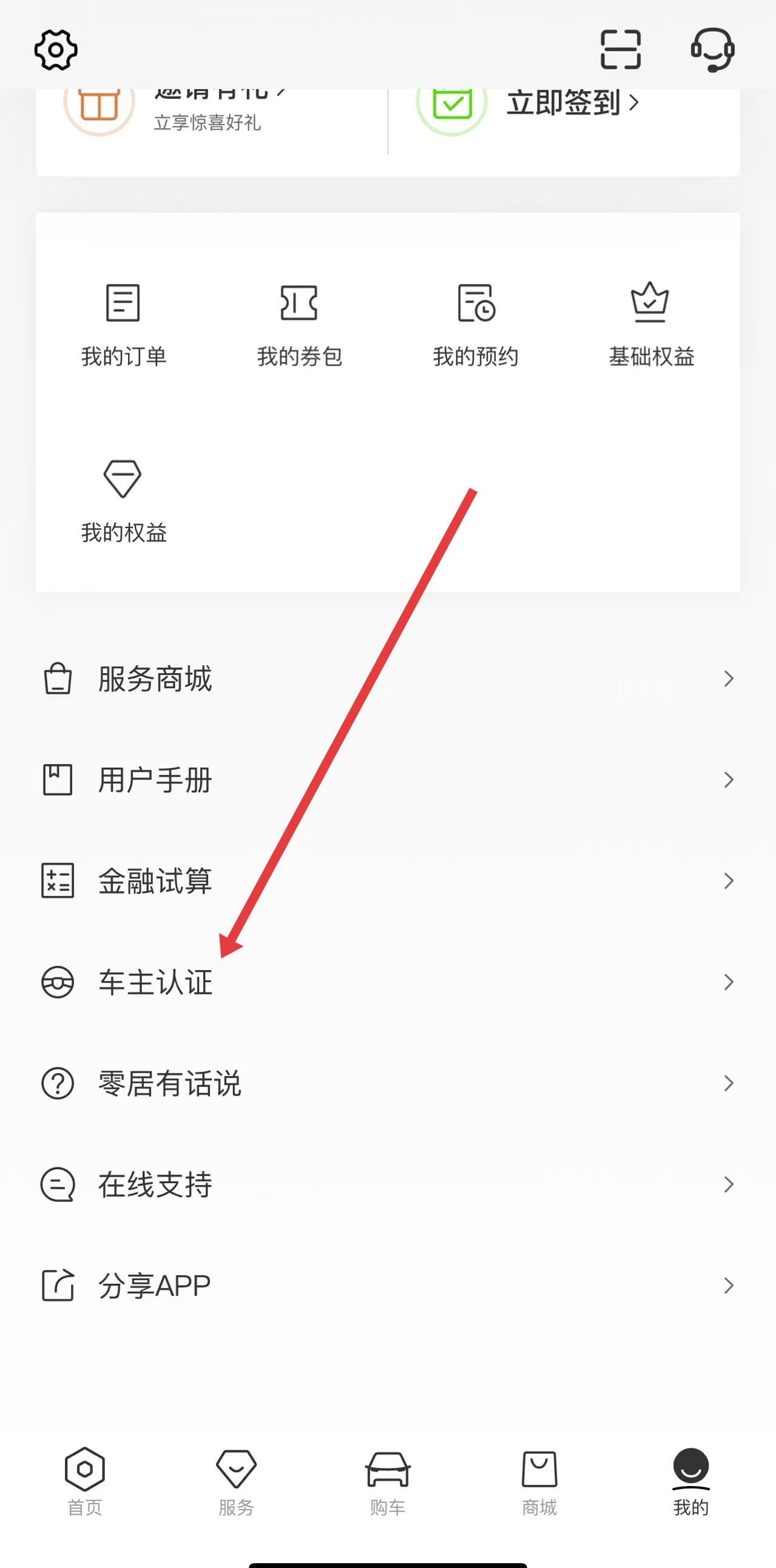 2、在我的頁(yè)面中,向下滑動(dòng)找到并點(diǎn)擊車(chē)主認(rèn)證選項(xiàng)。