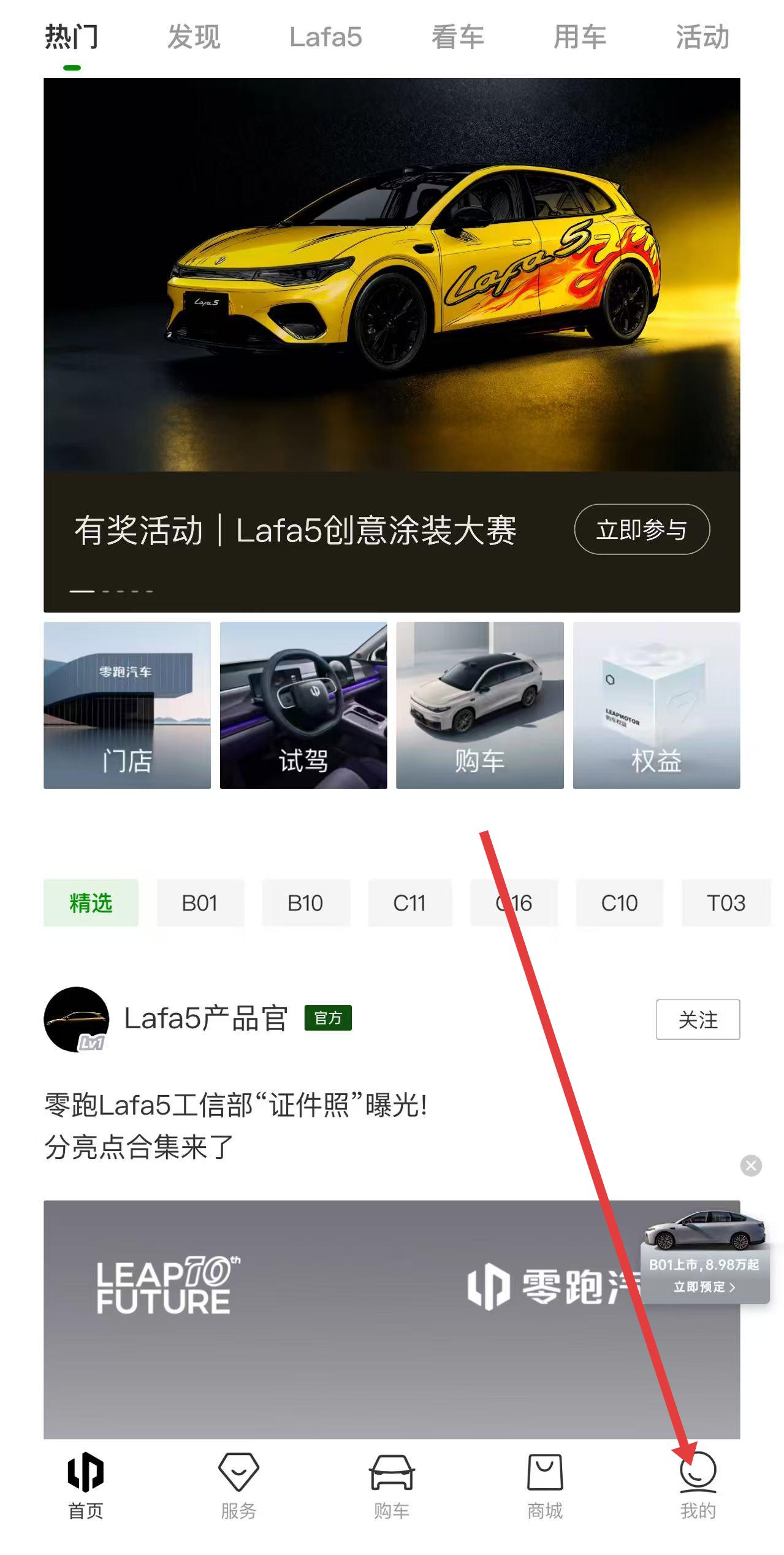 1、打開(kāi)零跑APP,進(jìn)入首頁(yè)后,點(diǎn)擊底部導(dǎo)航欄最右側(cè)的我的選項(xiàng)。
