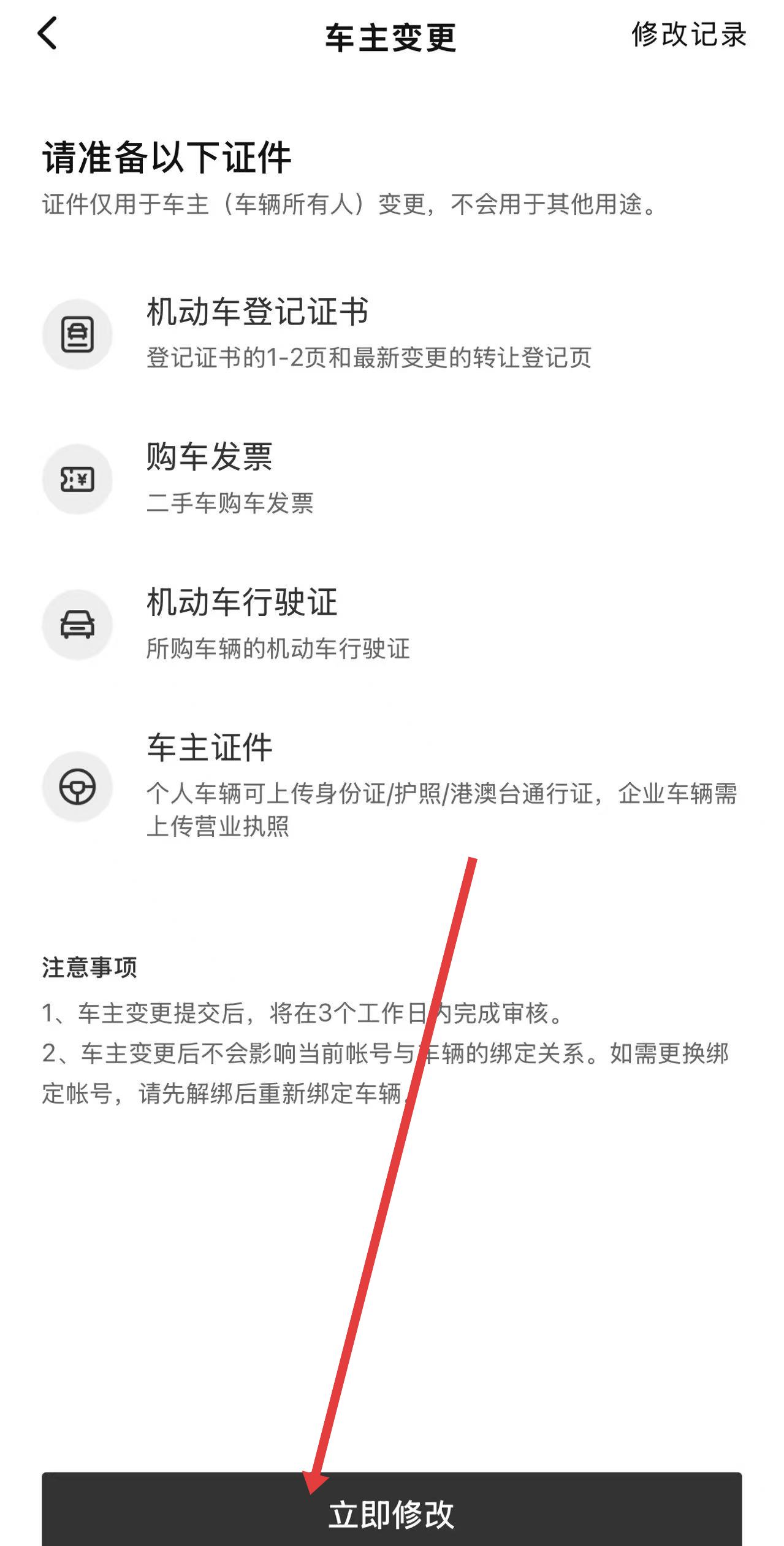 4、在車(chē)主變更頁(yè)面,點(diǎn)擊立即修改,按照提示上傳對(duì)應(yīng)照片并提交,等待審核即可。
