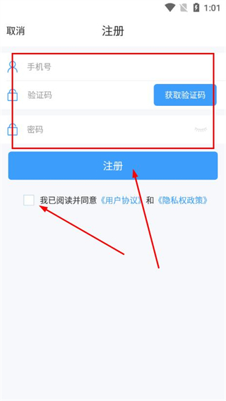 2、輸入手機號,點擊獲取驗證碼并填入,設置登錄密碼,勾選協(xié)議,點擊注冊。