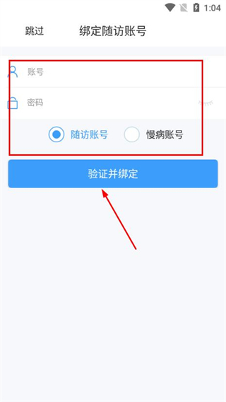 3、選擇綁定隨訪賬號或慢病賬號,輸入賬號和密碼后點擊驗證并綁定,完成注冊。