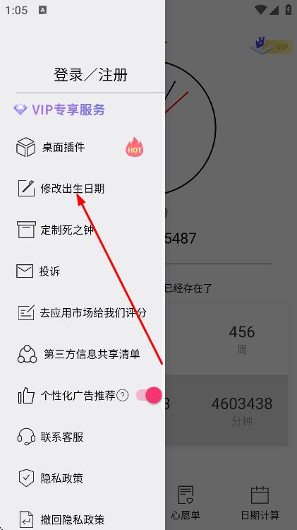2、在側(cè)邊菜單中,找到并點(diǎn)擊修改出生日期選項(xiàng)。