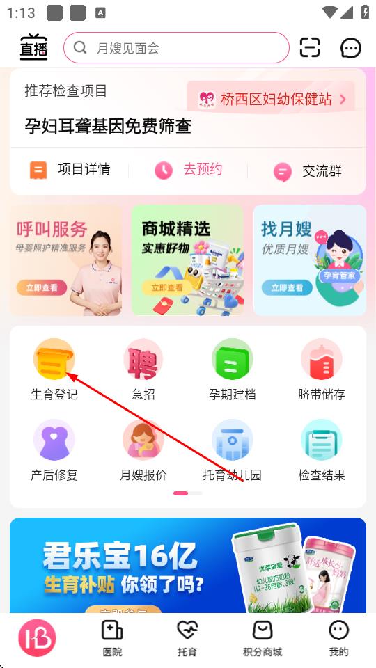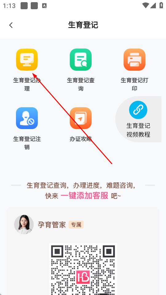 1、打開孕健康A(chǔ)PP,在首頁找到生育登記圖標(biāo),點擊進(jìn)入。