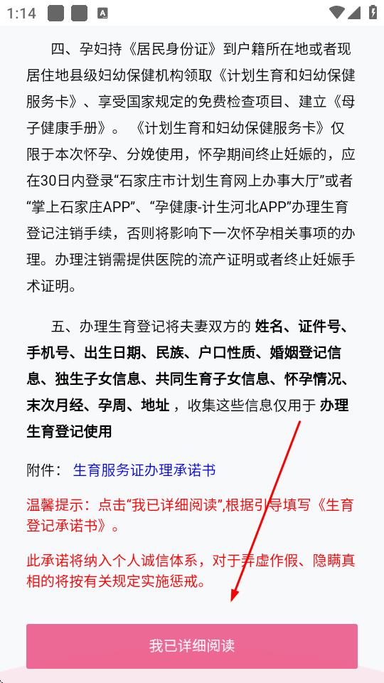4、仔細(xì)閱讀辦理生育登記的相關(guān)說明及要求,點擊我已詳細(xì)閱讀按鈕。