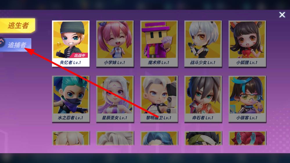 3、在角色選擇界面,點(diǎn)擊左側(cè)追捕者或逃生者分類選項(xiàng)。