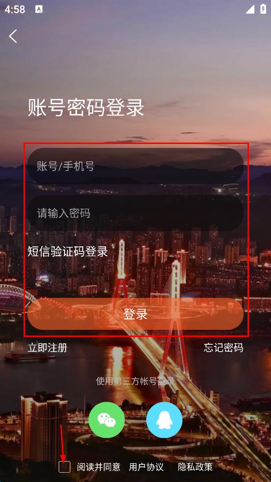 4、在帳號密碼登錄界面,勾選“閱讀并同意用戶協(xié)議、隱私政策”,輸入賬號/手機號和密碼,點擊“登錄”即可。