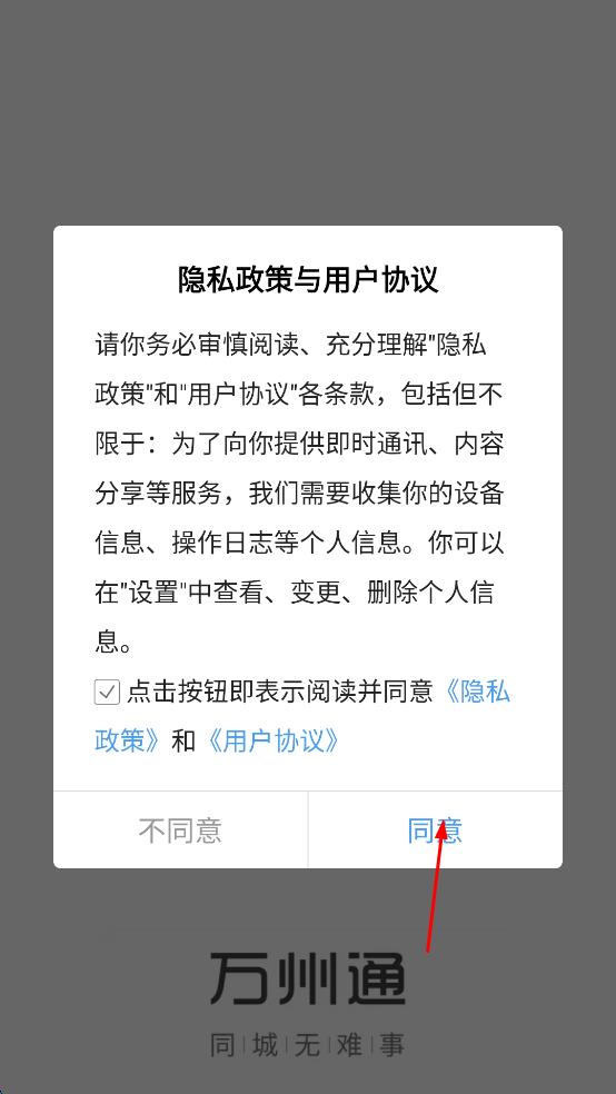 1、打開萬州通,在隱私政策與用戶協(xié)議提示框中,點擊“同意”,進入萬州通主界面。