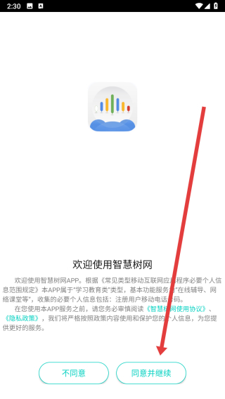 1、在打開(kāi)app后,可以通過(guò)點(diǎn)擊屏幕中的同意并繼續(xù)按鈕,進(jìn)入使用。