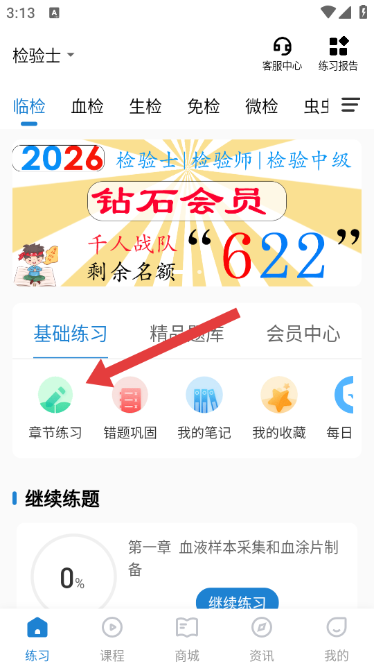 1、在練習(xí)的頁面,需要點(diǎn)擊章節(jié)練習(xí)的按鈕,進(jìn)入章節(jié)練習(xí)列表。