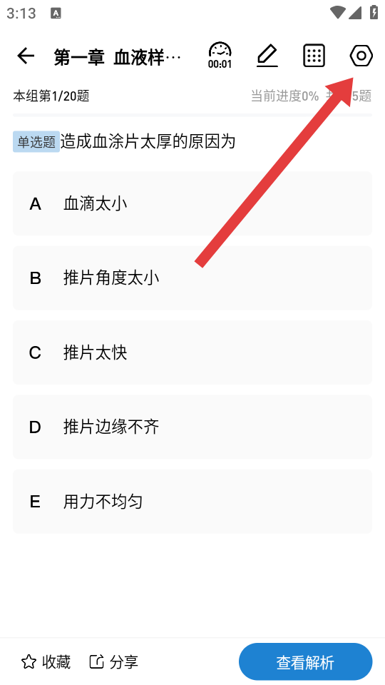 3、在章節(jié)練習(xí)題目界面,點(diǎn)擊右上角設(shè)置圖標(biāo),調(diào)出設(shè)置選項(xiàng)。