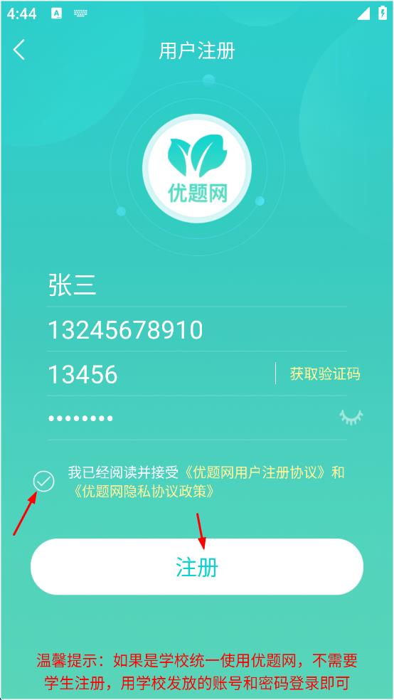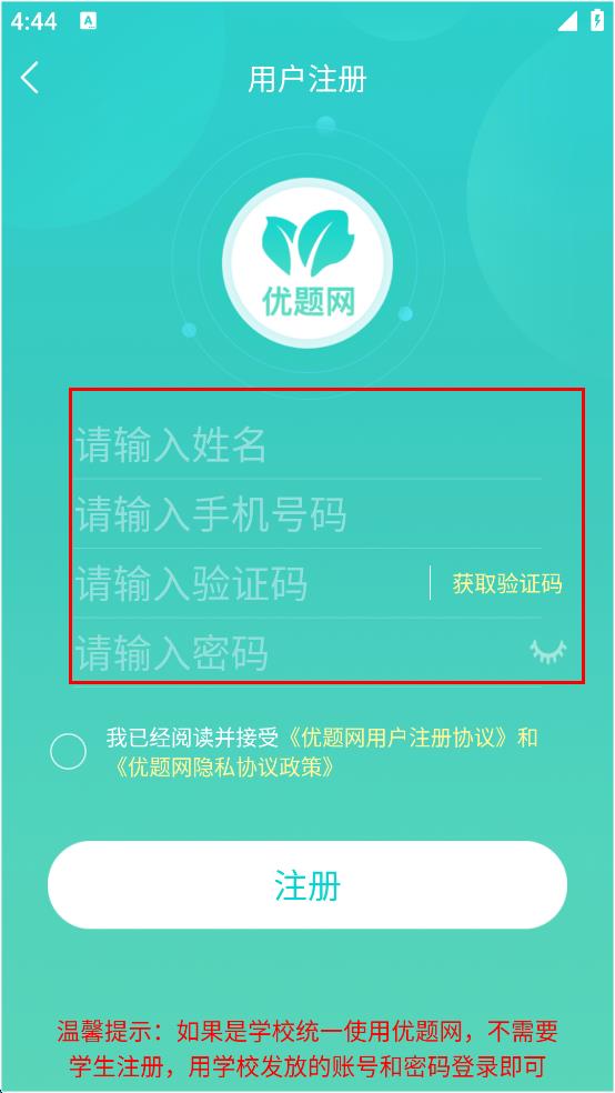 4、勾選我已經(jīng)閱讀并接受優(yōu)題網(wǎng)用戶注冊協(xié)議和優(yōu)題網(wǎng)隱私協(xié)議政策,點擊“注冊”按鈕完成用戶注冊。