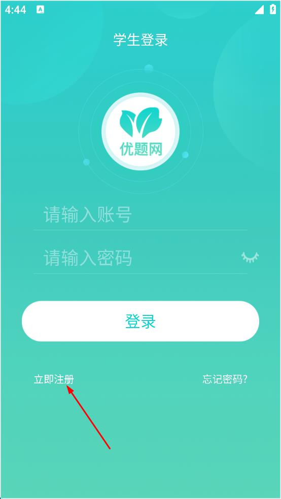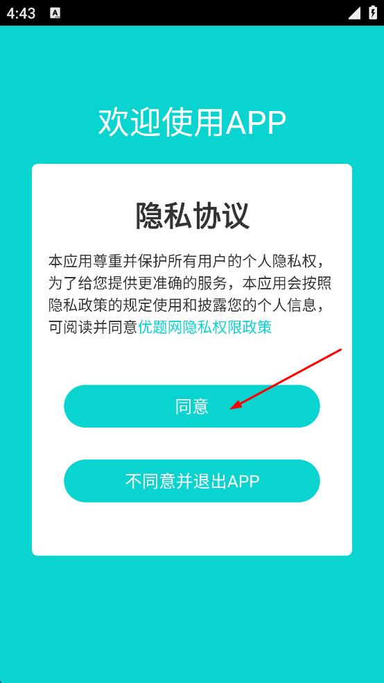 1、打開優(yōu)題網(wǎng)APP,出現(xiàn)隱私協(xié)議界面,仔細閱讀后點擊“同意”,進入學(xué)生登錄頁面。