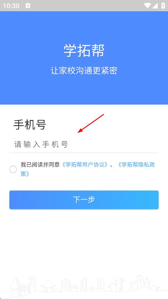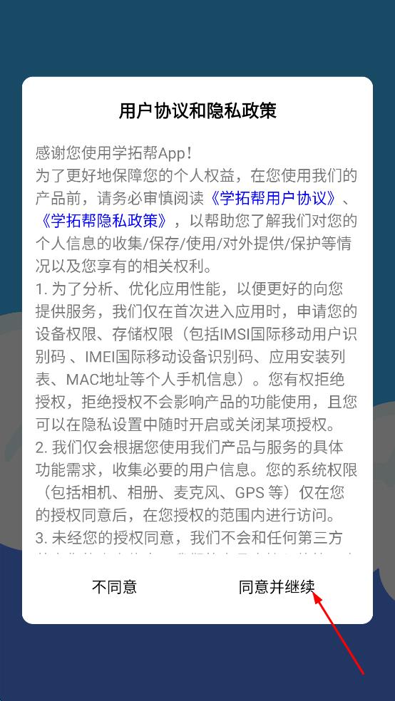1、打開學(xué)拓幫,在彈出的用戶協(xié)議和隱私政策頁面,點擊同意并繼續(xù),進入手機號輸入頁面。