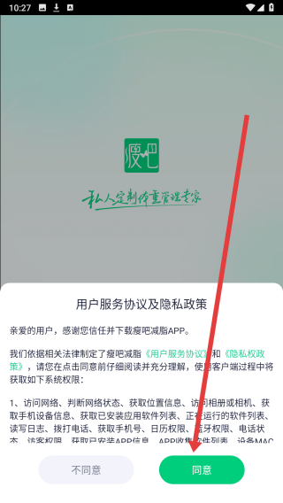 1、打開瘦吧app后,可以點擊同意按鈕后,開始進入使用。