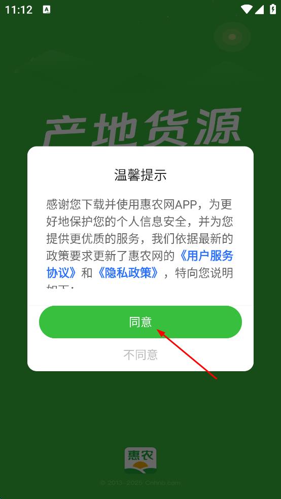 1、打開惠農(nóng)網(wǎng)APP,在彈出的溫馨提示框中,點擊同意。