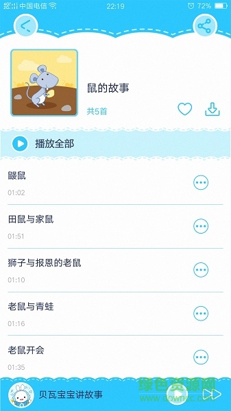 貝瓦故事是一款幼兒故事app。這款app有大量的童話(huà)教育故事,而且是語(yǔ)音版本的,這就是說(shuō)家長(zhǎng)只需要將這款app放在孩子旁邊設(shè)置好定時(shí)功能就可以代替父母給孩子講睡前故事了。這些故事都是精挑細(xì)選的一些早教類(lèi)型的小故事非常具有教育性和益智性,想要來(lái)體驗(yàn)一下就快來(lái)綠色資源網(wǎng)下載吧。