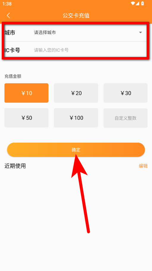 3、進入公交卡充值頁面后,先選擇所在城市,再輸入IC卡號,選擇合適的充值金額,點擊確定,根據(jù)后續(xù)提示完成支付,即可完成公交卡充值操作。