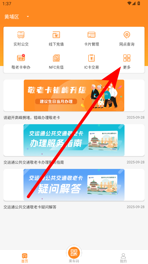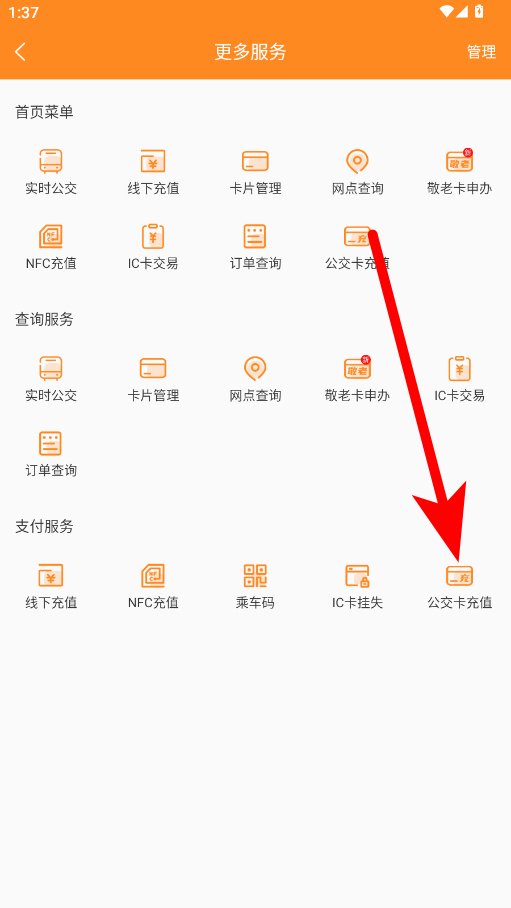 2、在更多服務(wù)界面里,找到并點擊公交卡充值選項。
