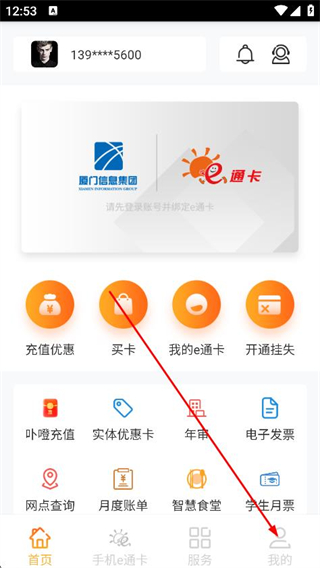 1、打開e通卡app,進入首頁,點擊底部導航欄最右側(cè)我的選項。