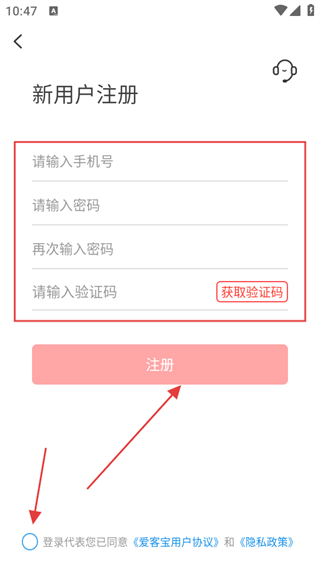 4、輸入手機號、密碼、再次輸入密碼,驗證碼,勾選同意用戶協議和隱私政策,點擊注冊。