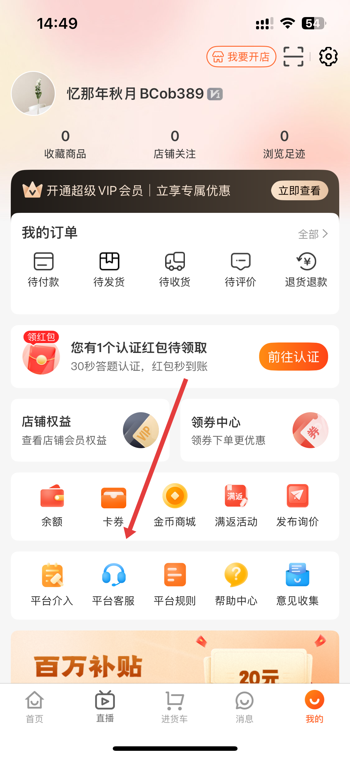2、在我的頁面中,在下方找到并點(diǎn)擊平臺客服選項(xiàng),進(jìn)入客服相關(guān)界面。