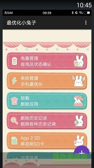 最優(yōu)化小兔子可愛的優(yōu)化工具應(yīng)用,界面是真的蠻可愛的,擁有電量管理、系統(tǒng)管理、卸載、刪除歷史記錄、APP移動(dòng)到SD卡、設(shè)置