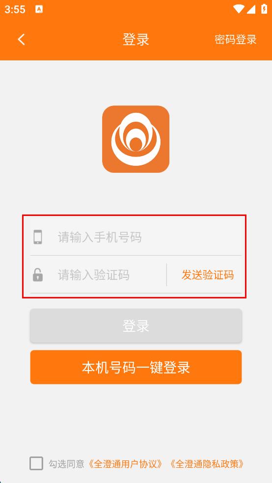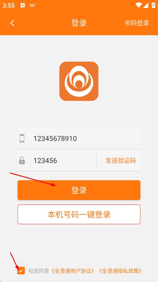 4、勾選同意全澄通用戶協(xié)議,全澄通隱私政策,然后點擊橙色“登錄”按鈕,完成登錄操作。