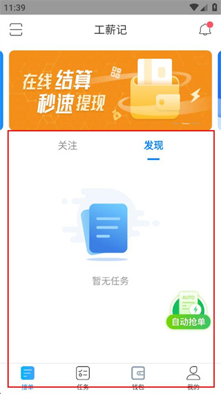 4、注冊(cè)完成后,進(jìn)入工薪記軟件的接單頁(yè)面,可查看關(guān)注和發(fā)現(xiàn)板塊的任務(wù)情況。