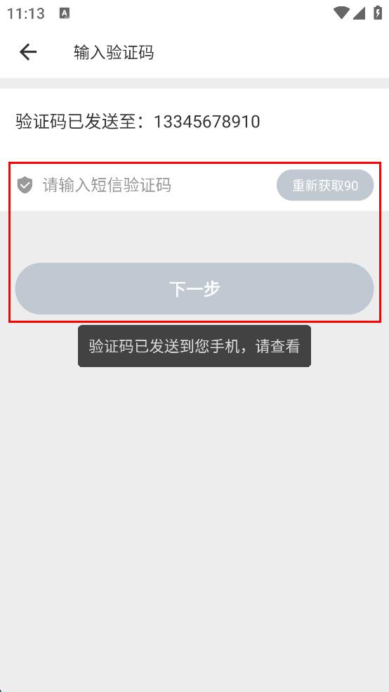 4、在輸入驗(yàn)證碼頁面,輸入收到的短信驗(yàn)證碼,點(diǎn)擊“下一步”按鈕,完成登錄操作。