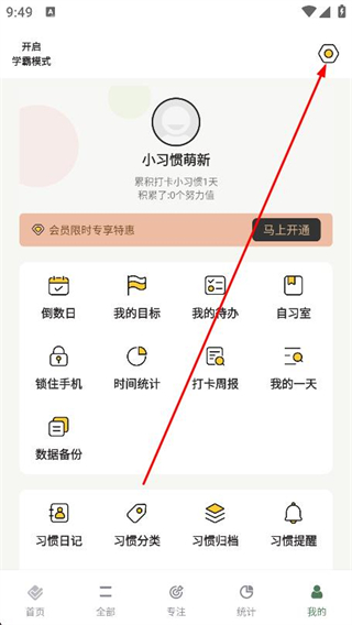 2、在我的頁(yè)面,找到并點(diǎn)擊右上角的設(shè)置圖標(biāo)。