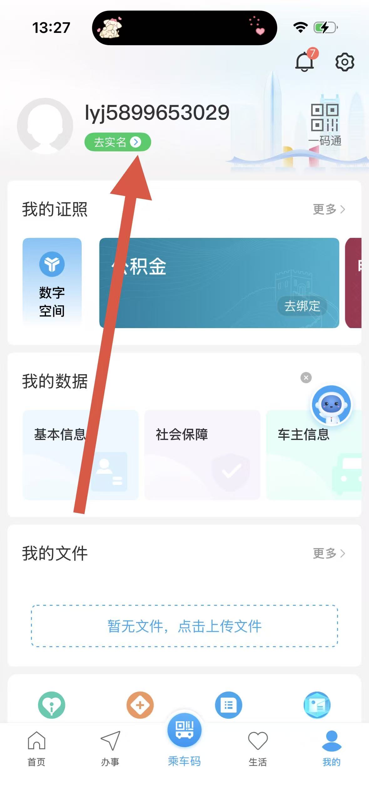 2、在個人頁面中,點擊去實名按鈕,進入實名認證界面。