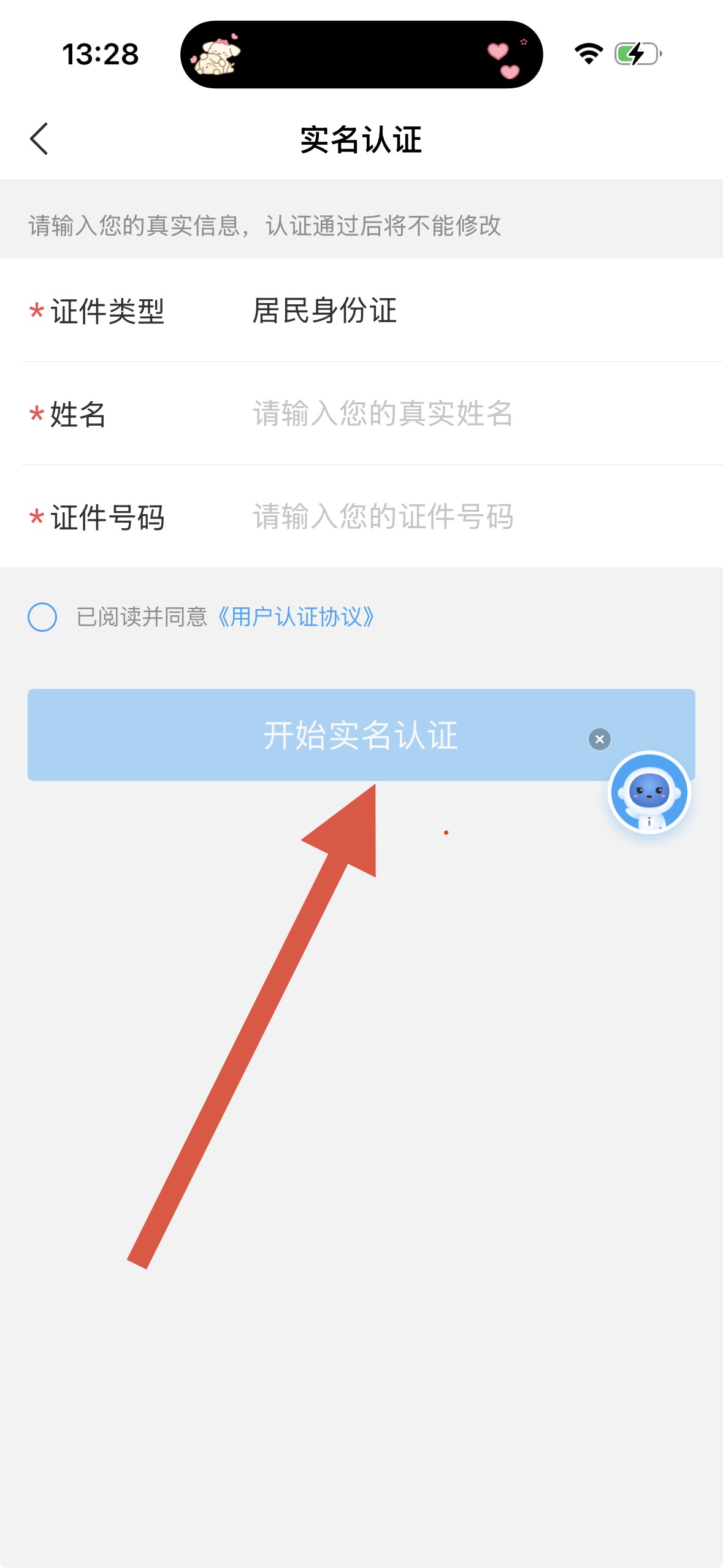 4、選擇認證方式后,輸入真實姓名、證件號碼等信息,并勾選同意《用戶認證協(xié)議》,然后點擊開始實名認證完成認證操作。