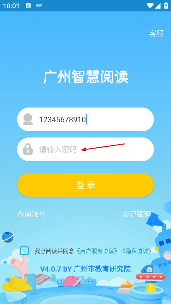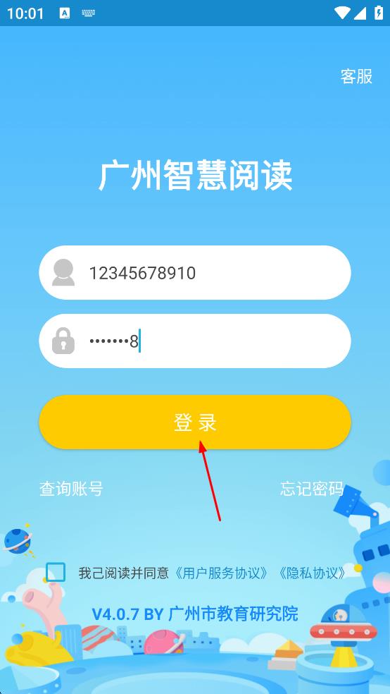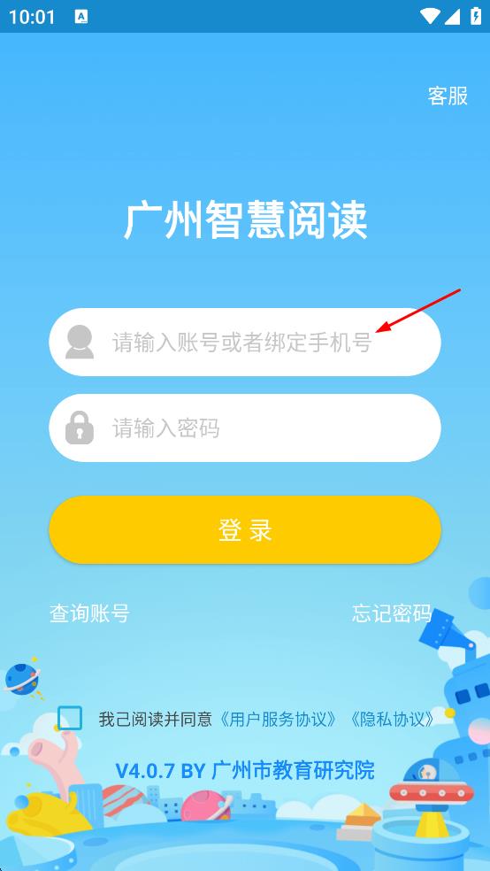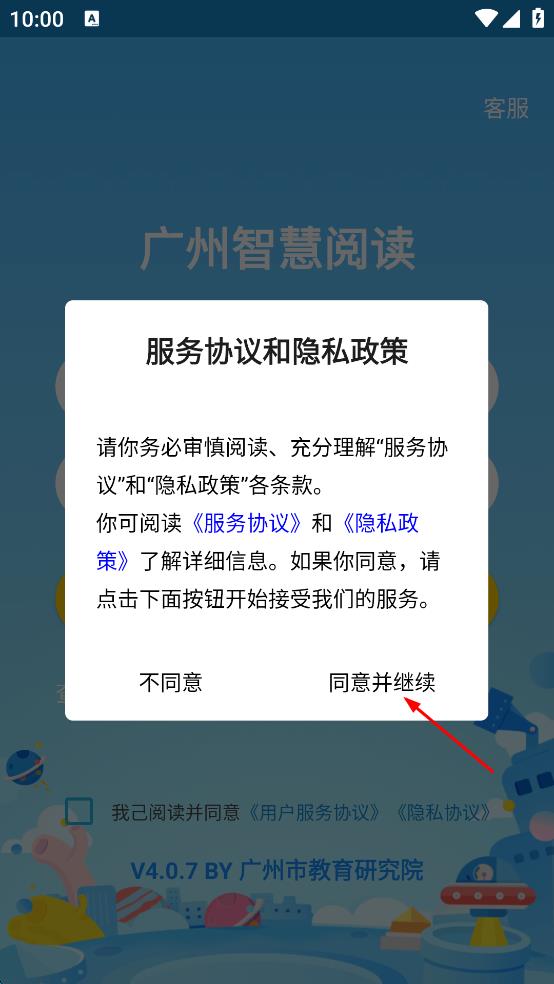1、打開(kāi)廣州智慧閱讀,在彈出的服務(wù)協(xié)議和隱私政策頁(yè)面,點(diǎn)擊同意并繼續(xù),進(jìn)入登錄頁(yè)面。