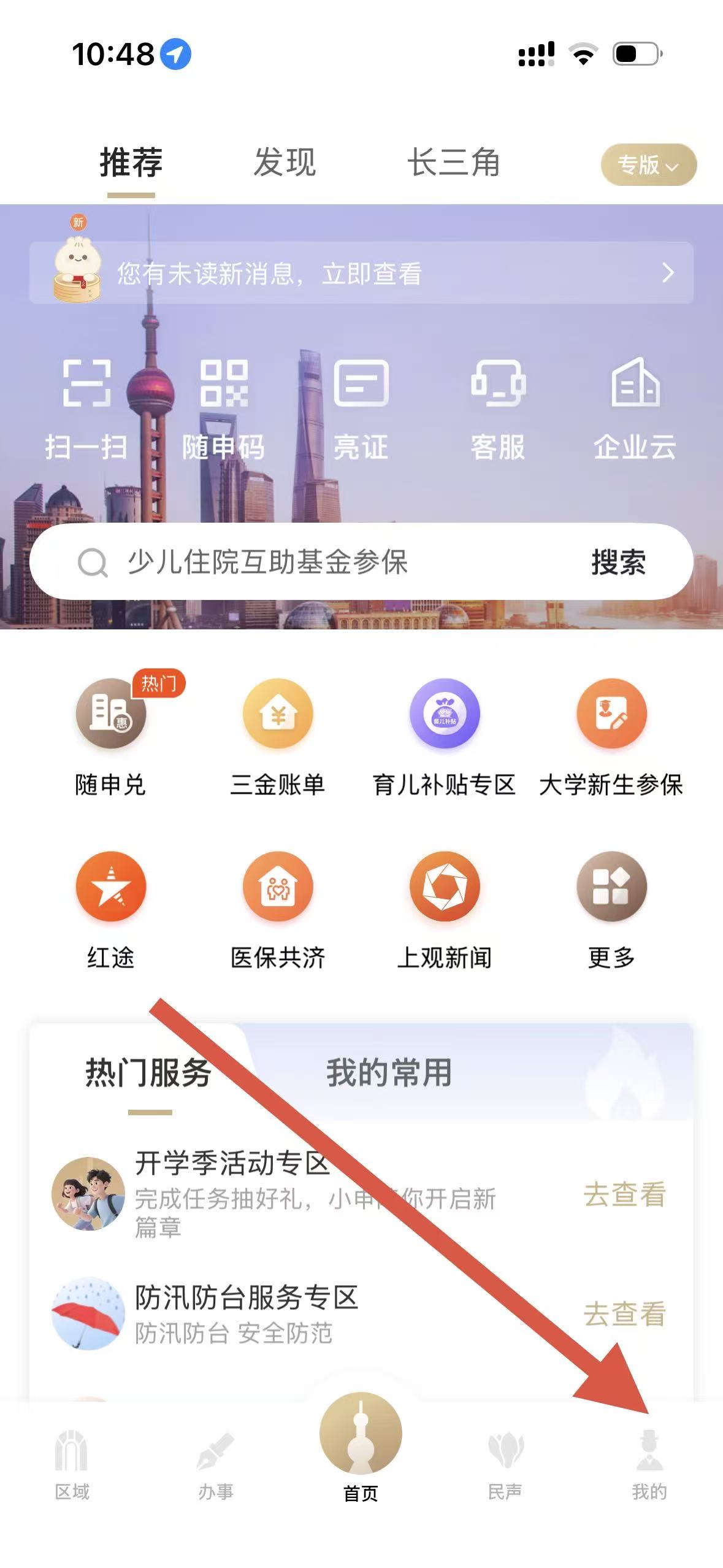 1、在隨申辦市民云首頁,點(diǎn)擊右下角我的選項(xiàng),進(jìn)入個(gè)人界面。