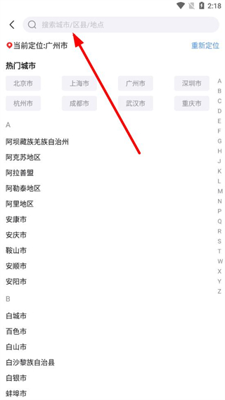 2、進入城市選擇頁面后,在搜索欄輸入要修改的城市名稱。