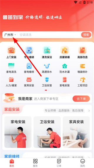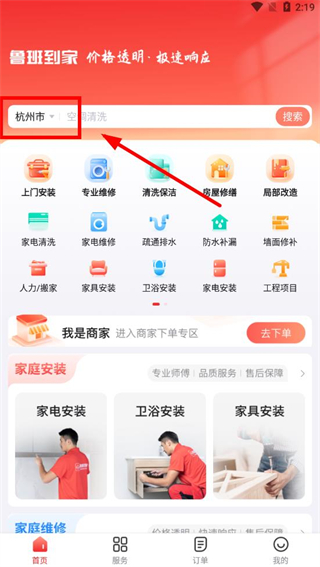 1、打開魯班到家app,在首頁點擊當前城市的區(qū)域位置。