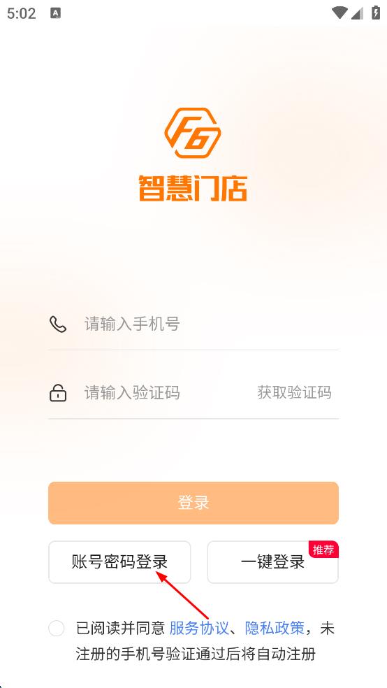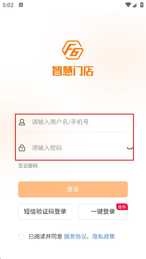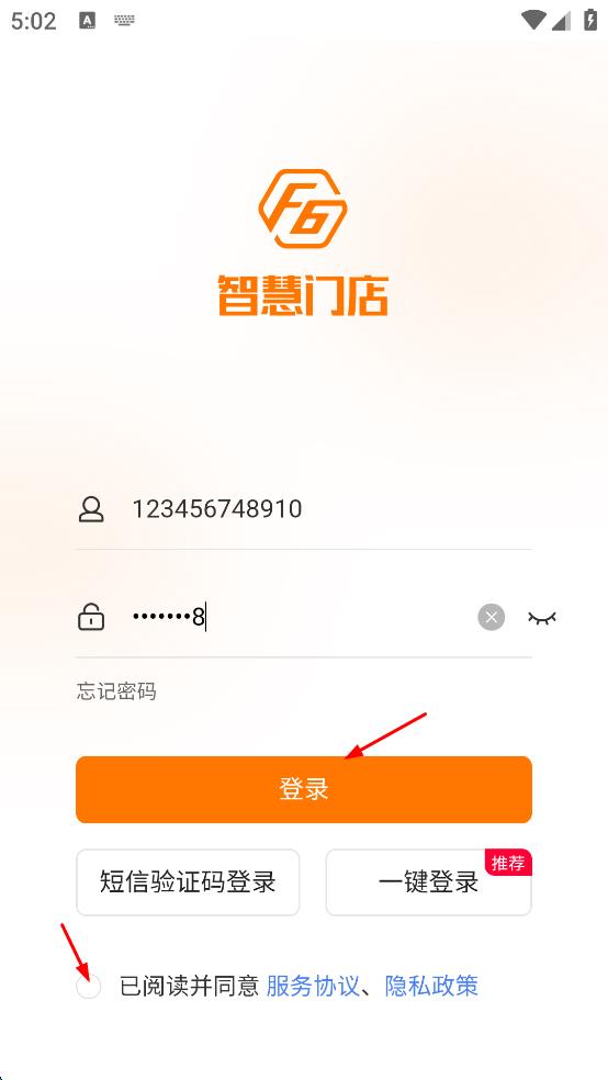 4、用戶名或手機(jī)號(hào)、密碼都填寫完畢且勾選同意相關(guān)協(xié)議后,點(diǎn)擊“登錄”按鈕,即可完成智慧門店APP的登錄操作。