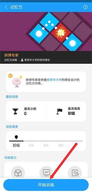 3、在記憶力訓練詳情頁面,點擊開始訓練,進入拆彈專家訓練游戲界面。