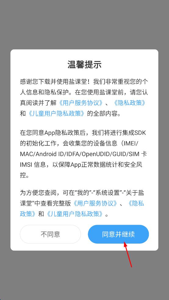 1、打開鹽課堂,在彈出的溫馨提示頁面,點(diǎn)擊同意并繼續(xù),進(jìn)入鹽課堂選課頁面。